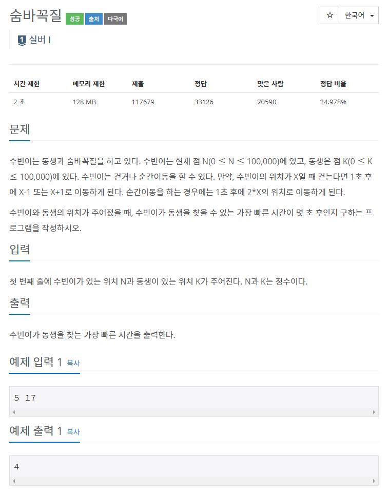 수빈이는 동생과 숨바꼭질을 하고 있다. 수빈이는 현재 점 N(0 ≤ N ≤ 100,000)에 있고, 동생은 점 K(0 ≤ K ≤ 100,000)에 있다. 수빈이는 걷거나 순간이동을 할 수 있다. 만약, 수빈이의 위치가 X일