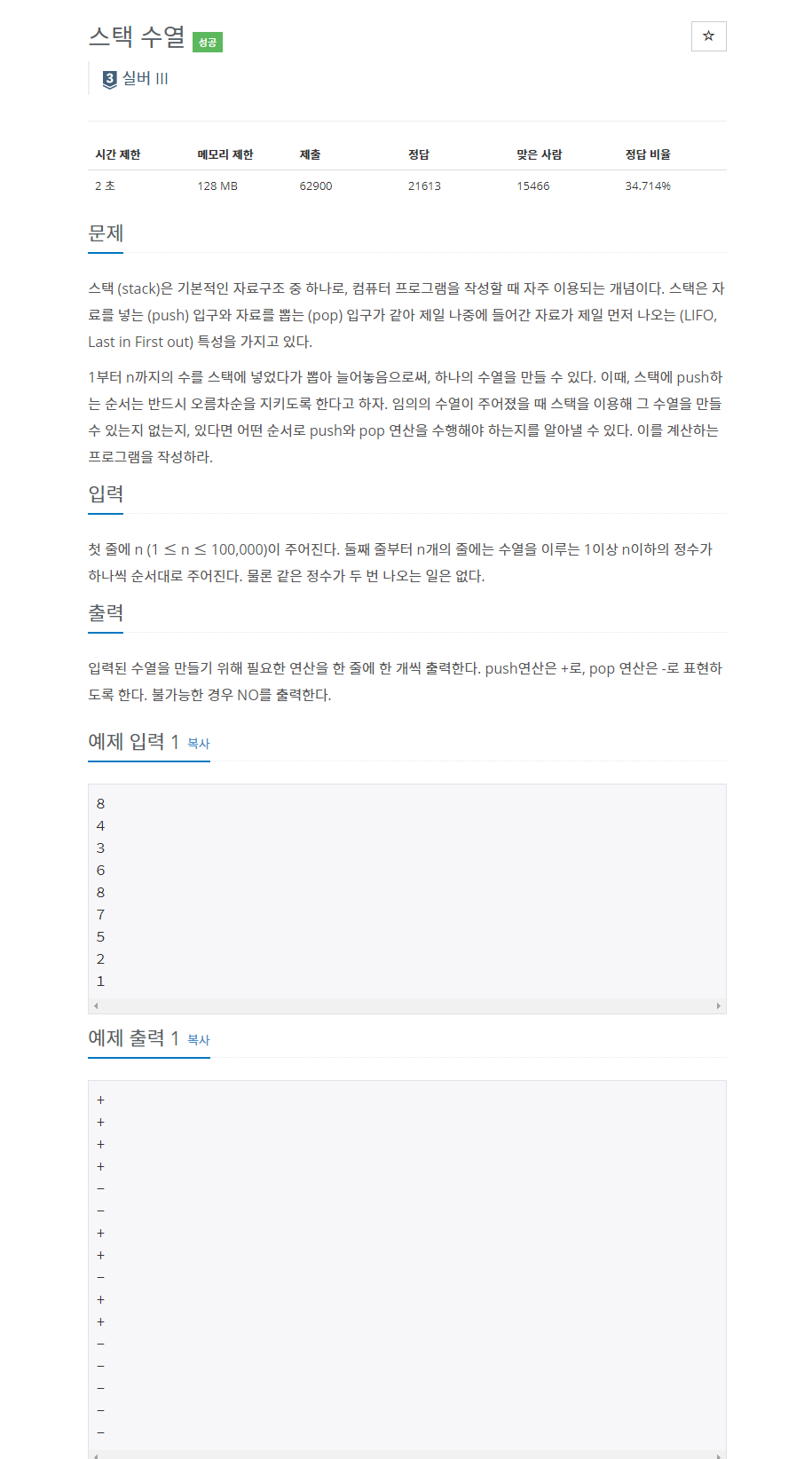 1부터 n까지에 수에 대해 차례로 [push, push, push, push, pop, pop, push, push, pop, push, push, pop, pop, pop, pop, pop] 연산을 수행하면 수열 [4, 3, 6, 8, 7, 5, 2, 1]을 얻을 수 있다.