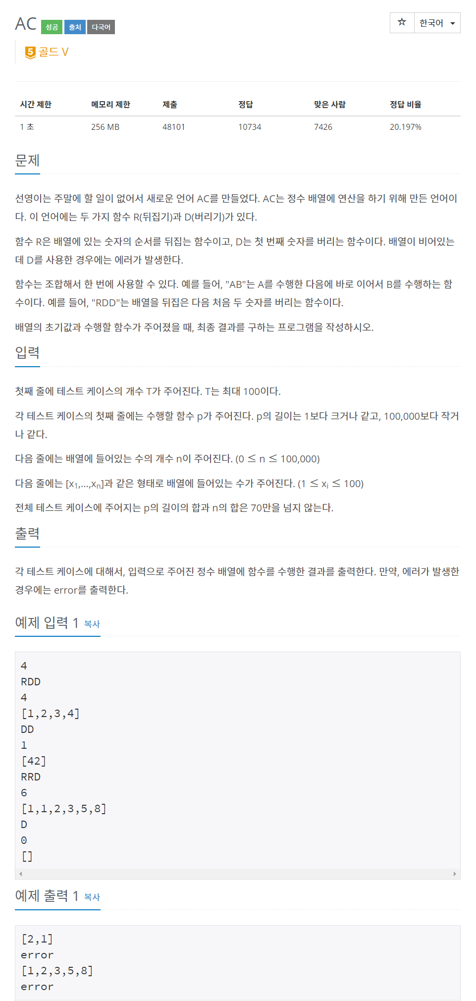 [BOJ/백준] 5430번 AC | 덱 | 파이썬